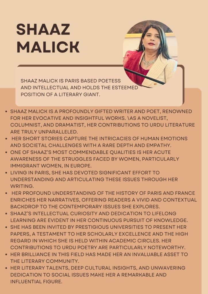 افسانہ نگار ناول نگار شاعرہ تصوف کے رنگ میں رچی بسی دیار غیر میں رہ کر بھی روایت سے جڑی ہوئی ہیں مجاز سے حقیقی کے سفرکو شاعری افسانوں اور ناول میں زیادہ اہمیت دیتی ہیں روح عشق روح آشنا عشق گوہر ذات دل درگاہ روزن زیست کاسہ من دل صحرا ذات سمندر ذرا تم ساتھ میں رہنا آپ کی تصانیف ہیں.